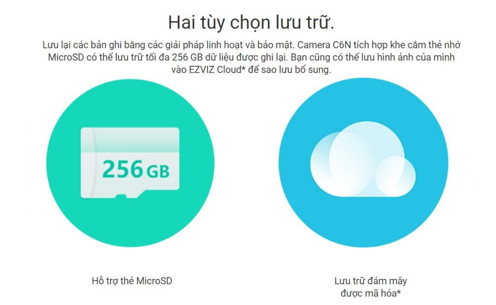 C6N 4MP cung cấp hai tùy chọn lưu trữ: Bạn chọn lưu trữ trong thẻ nhớ mua rời gắn vào khe cắm thẻ nhớ trên camera. Tùy chọn thứ 2 lưu trên đám mây với chi phí thấp với rất nhiều ưu điểm khi mất điện hoặc camera bị hư vẫn có thể xem lại dữ liệu camera dễ dàng.